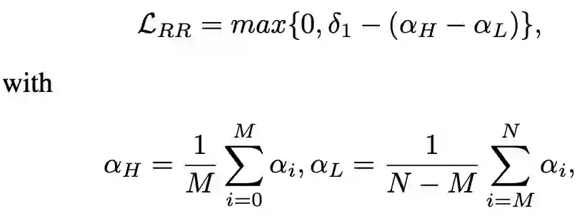 上述模块中的 self-attention weights可以在(0,1)中任意值,为了明确地约束不确定样本的重要性,作者精心设计了一个rank regularization模块来正则化注意权重。在rank regularization模块中,首先将学习到的注意权重按降序排序,然后将它们分成两组,比率β。rank regularization保证了高重要群体的平均注意权重高于具有margin的低重要群体。在形式上为此定义了一个rank regularization损失(RR-Loss),如下所示: