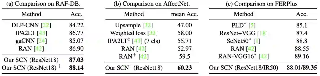 这些不确定性成为了深度学习时代大规模面部表情识别的关键挑战之一。为了解决这个问题,本次投稿的作者提出了一种简单而有效的Self Cure Network(SCN),它能有效地抑制不确定性,防止深度网络对某些面部图像的过度拟合。具体来说,主要通过两种方法: