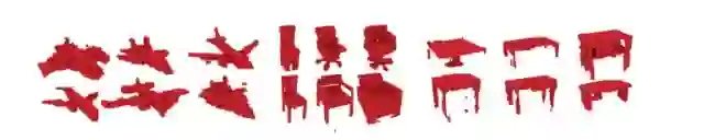文中做了许多实验,以此来说明借助GAN的交互式建模工具对初学者来说十分有用。实验中采用了ShapeNet Core55数据集并对其进行了扩展。我们使用了椅子、飞机和桌子等不同种类的物体进行建模实验,结果如下图所示: