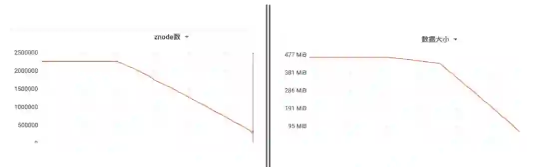 有时用户正在使用的 Topic 不多,但 zk-node 数量却很大,Pulsar 对 zk-node 的放大倍数较高。上图拐点是 zk-node 脏数据清理的时点,可以看到 zk-node 数据泄漏的情况非常严重,达到 5 倍之多。