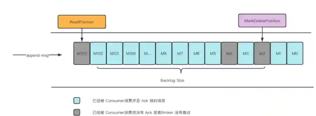此外,还需要注意的是 Pulsar 计算 Backlog Size 的方式。上图可以理解为一个事件流,生产者源源不断地 append message。Pulsar 计算 Backlog Size 时,是计算从当前 MarkedDeletedPosition 的位置,到 ReadPosition 的位置之前的 Backlog Size,而后结合 Producer Exception 策略暴露出来。如果 Ack 空洞,比如 Broker 侧请求失败,或者客户代码产生异常导致 Ack 永远不会被调用,Backlog Size 会到达一定速率,就相当于限制生产者。上图中,M4 和 M2 是两条空洞消息,出现这样的空洞消息时,生产者的发送流就迟早会被打断。