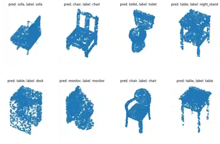 data = test_dataset.take(1)points, labels = list(data)[0]points = points[:8, ...]labels = labels[:8, ...]# run test data through modelpreds = model.predict(points)preds = tf.math.argmax(preds, -1)points = points.numpy()# plot points with predicted class and labelfig = plt.figure(figsize=(15, 10))for i in range(8):ax = fig.add_subplot(2, 4, i + 1, projection="3d")ax.scatter(points[i, :, 0], points[i, :, 1], points[i, :, 2])ax.set_title("pred: {:}, label: {:}".format(CLASS_MAP[preds[i].numpy()], CLASS_MAP[labels.numpy()[i]]))ax.set_axis_off()plt.show()
