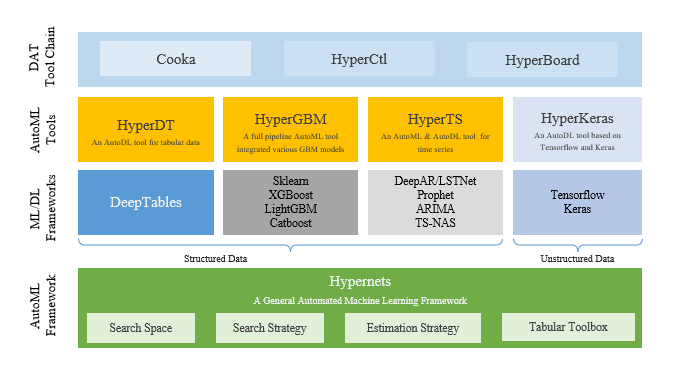 DAT 的所有项目都是以开源方式来开发的。(开源地址:https://github.com/DataCanvasIO)。DAT(DataCanvas AutoML Toolkit)是一个自动机器学习工具套件包,它包含了首个 AutoML 开源架构 Hypernets 和一系列功能强大的 AutoML 开源工具,从底层的通用自动机器学习框架到用于结构化及非结构化领域端到端的自动建模工具。DAT 包含 DeepTables、Hypernets、HyperGBM、HyperTS、 Cooka、HyperBoard 、HyperCtl。DAT 性能突破了机器学习建模过程中存在的不均衡、概念漂移、泛化能力、大规模数据 4 大难点。