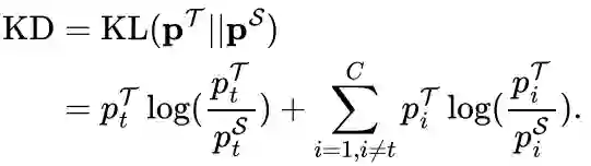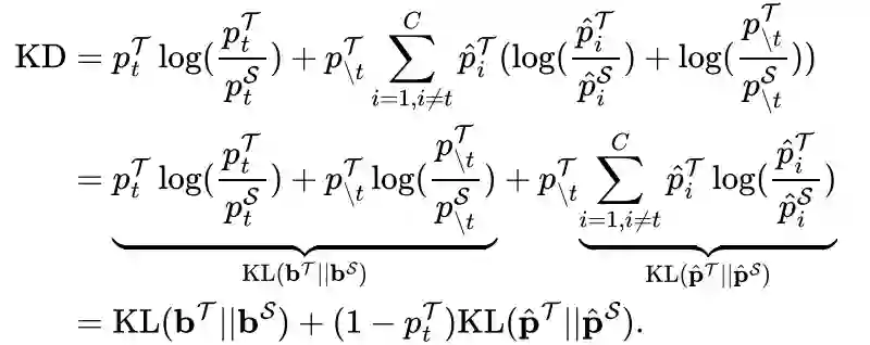 该研究将第一项命名为目标类别知识蒸馏 Target Class Knowledge Distillation(下文简称 TCKD),将第二项中的 KL 散度命名为非目标类别知识蒸馏 Non-target Class Knowledge Distillation(下文简称 NCKD)。