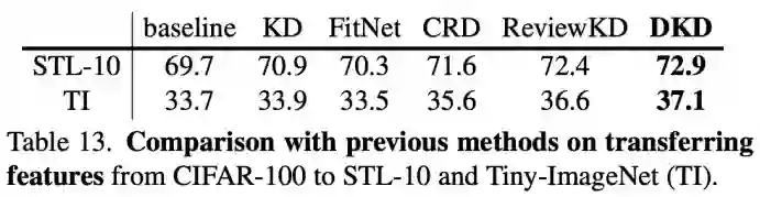 这里该研究尝试将 DKD 训练得到的 student 网络进行特征迁移。如表 13 所示,研究者将在 CIFAR-100 上训练的 student 迁移到了 STL-10 和 TinyImageNet 两个数据集上,在众多的蒸馏方法中,DKD 取得了最好的迁移效果。