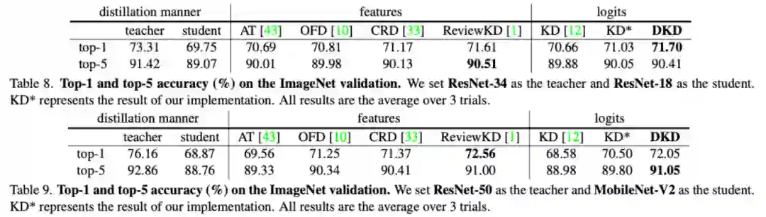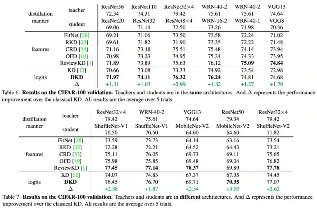 表 6~9 中提供了 DKD 在 CIFAR-100 和 ImageNet-1K 两个分类数据集上的蒸馏效果。和 KD 相比,DKD 在所有数据集和网络结构上都有明显的性能提升。此外,与过去最好的特征蒸馏方法(ReviewKD)相比,DKD 也取得了接近甚至更好的结果。DKD 成功使得 logits 蒸馏方法重新回到了 SOTA 的阵营中。