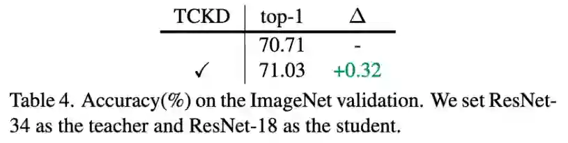 ImageNet 是一个比 CIFAR-100 更困难的数据集,所以该研究在 ImageNet 上也进行了尝试。从表 4 可以看出,在 ImageNet 上只使用 NCKD 的效果也是没有同时使用 TCKD 和 NCKD 要好的。