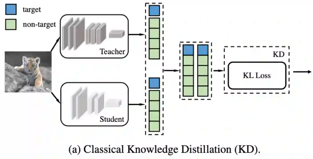 该研究尝试一种拆解的方法来更深入地分析 KD:将 logits 分成两个部分(如图),蓝色部分代表目标类别(target class)的 score,绿色部分代表非目标类别(Non-target class)的 score。这样的拆解使得我们可以重新推导 KD 的 Loss 公式,得到一个新的等价表达式,进而做更多的实验和分析。