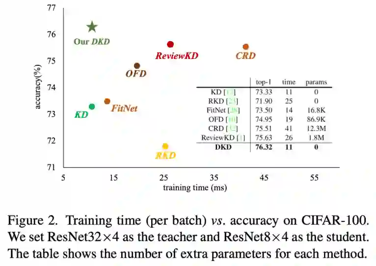 logits 蒸馏的好处之一是训练效率高。为了证明这一点,该研究可视化了 SOTA 蒸馏方法的训练开销。图 2 的 X 轴是每个 batch 的训练时间,Y 轴是 student 的 top-1 accuracy。显然,logits 蒸馏(KD 和 DKD)所需的训练时间是最少的,并且 DKD 用了最少的时间获得了最好的蒸馏效果。图 2 中的表格也提供了训练时间和训练所需的额外参数量,和 KD 一样,DKD 也并没有额外引入参数量,同时训练时间也几乎没有增加。logits 蒸馏的优越性显而易见。