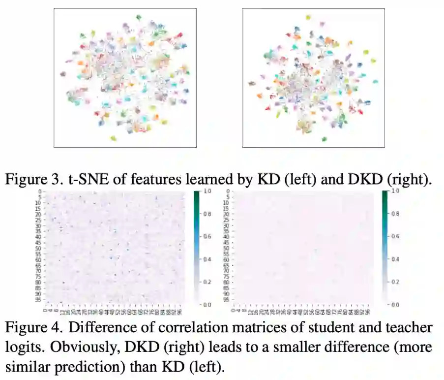 这里研究者提供了两种可视化。图 3 中,与 KD 相比,DKD 的样本聚得更加紧凑,说明 DKD 帮助 student 网络学到了更加可区分的特征。图 4 中,研究者计算了 teacher 网络和 student 网络输出 logits 的相似度,和 KD 相比,DKD 训练后的 student 产生的 logits 会更像 teacher 产生的 logits,说明 teacher 的知识被更好地利用了。