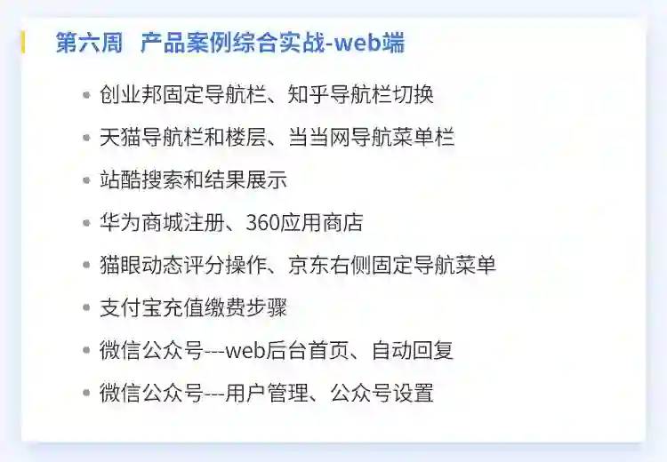 Axure实战班安排了6次直播课,老师会在直播课上讲解更多的交互和产品设计。让你在学Axure的同时,培养对产品的理解,对交互的感觉