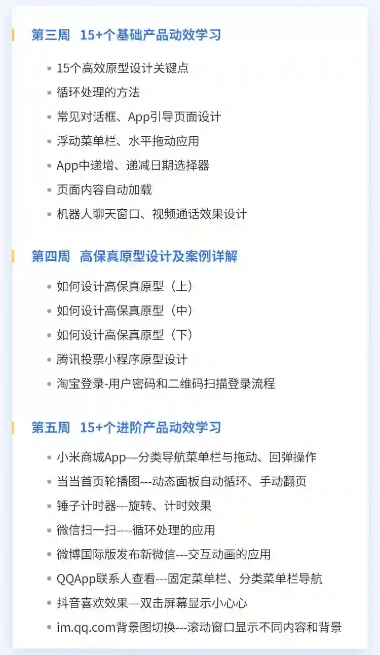 在前2周功能基础掌握的情况下,你会系统学习到web端、手机端的产品交互动效,进阶学习切换、拖动、平滑等15+个进阶效果