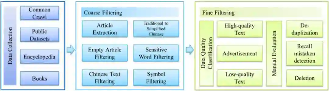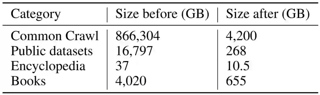 首先在数据采集阶段,源 1.0 主要基于 Common Crawl(爬取 2017 至 2021 年的网页数据,866,304GB)、开源语料(包括 SogouT 和 SogouN,16,797GB)、中文百科(百度百科和维基百科,37GB)和中文书籍(哲学、历史、人文、小说等书籍,4,020GB)等数据源,共采集了 846TB 的数据;