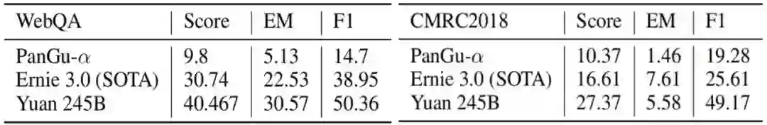 此外,源 1.0 在闭卷问答任务 WebQA 和文本提取任务 CMRC2018 中也表现得非常好。在这两个任务的测试中,模型直接回答 WebQA 和 CMRC2018 的问题,并且不提供任何辅助信息。