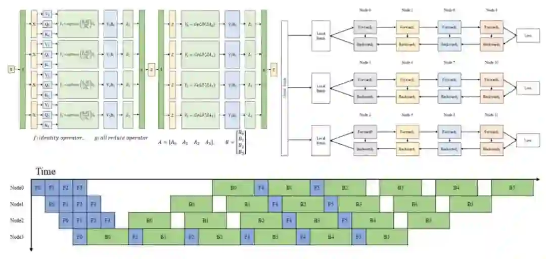 图上左为张量并行,上右为数据并行,图下 为流水线并行。