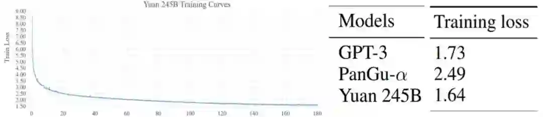 源 1.0 的模型训练损失(training loss)曲线如下,可以看到,loss 值在前 10B 个 tokens 期间迅速下降,之后下降较慢并趋于稳定,形成一个长尾。并且,源 1.0 的训练损失数值(1.64)小于 GPT-3(1.73)和 PanGu-α(2.49)。