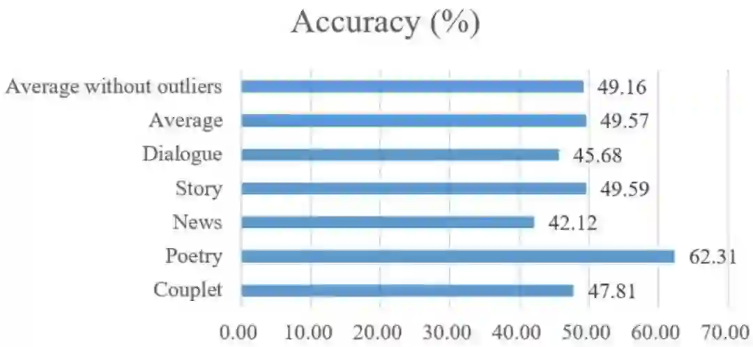具体地,浪潮任意选择了源 1.0 生成的 24 篇文章,包括 4 副对联、5 首中文传统和现代诗歌、5 篇新闻文章、5 个故事和 5 段对话。其中,对联、诗歌和对话的创作被视为短文本任务,新闻和故事生成被视为长文本任务。与这些对比的人类创作的文章出自名家所作的诗歌、经典小说、搜狐新闻的新闻文章和 LCCC-large 数据集中的对话。对此,浪潮共收集了 83 份有效问卷。
