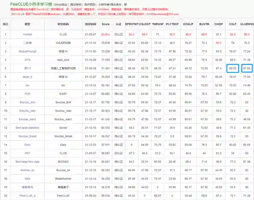 榜单详情参见:https://www.cluebenchmarks.com/fewclue.html