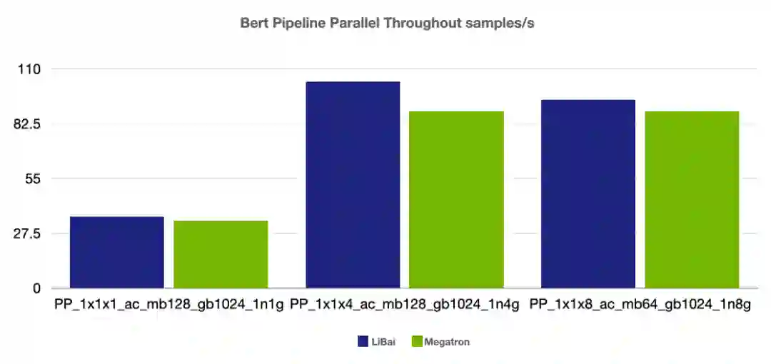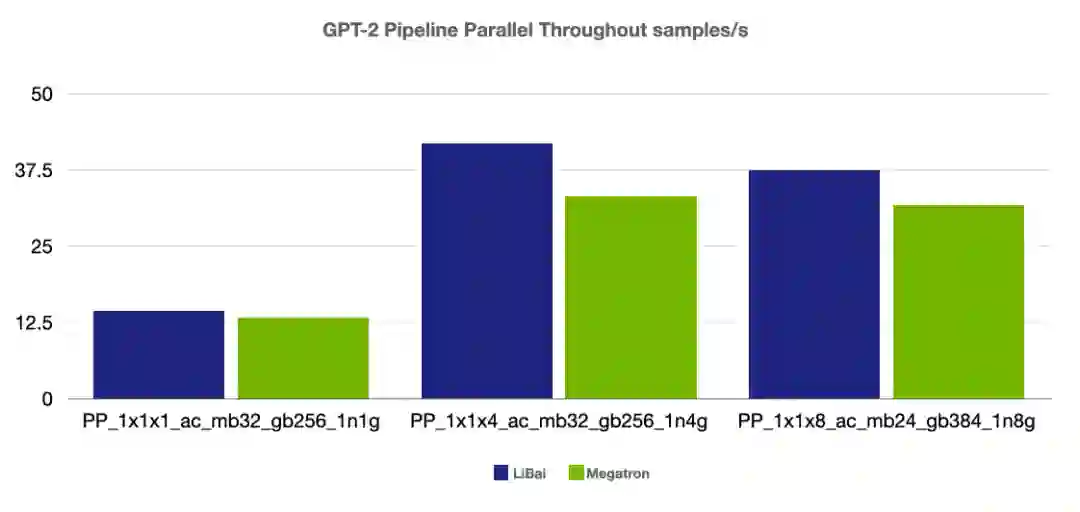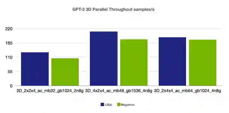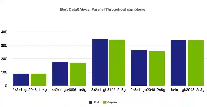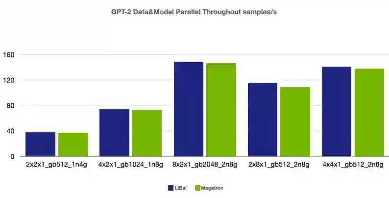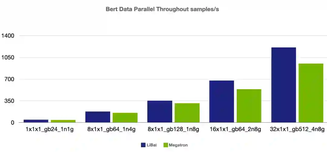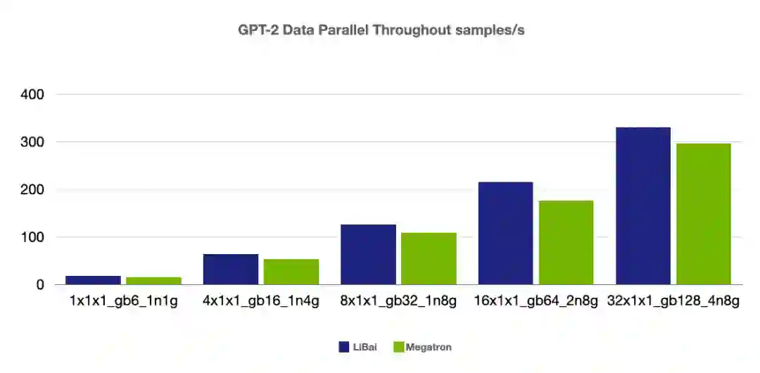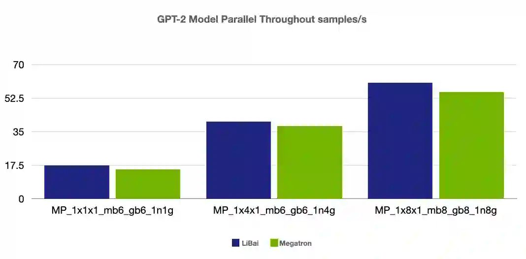 。通过和 Megatron-LM 进行严格的 kernel 对齐,实现了多种 kernel fusion 操作,同时得益于 OneFlow 静态图的设计,不管是单卡性能还是各种组合并行的效率,LiBai 都优于英伟达深度优化的 Megatron-LM 和微软的 DeepSpeed。