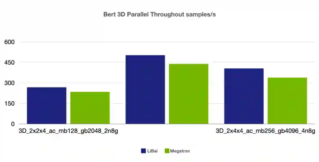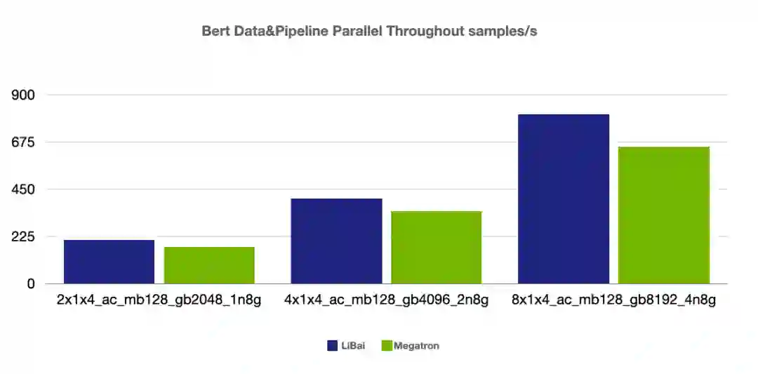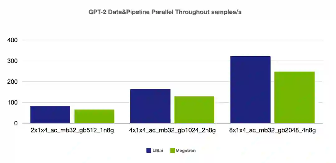 在 Bert、GPT-2 模型上,LiBai 的训练速度全方位超过 Megatron-LM。