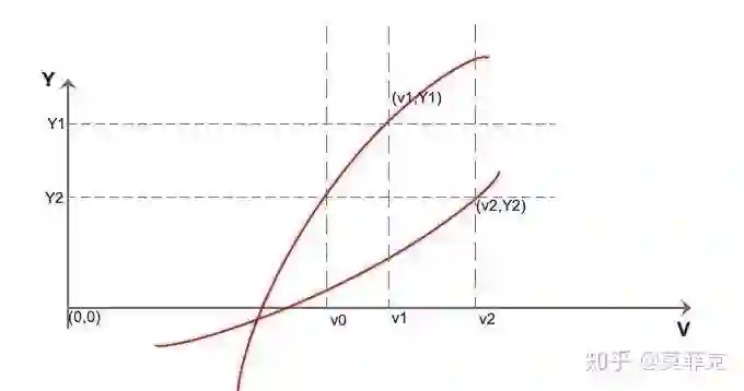下面我们用具体图形展示会更加直观,假设有两个买家1和买家2,虚拟估价函数分别如下所示,当他们的估价分别是v1<v2时,买家1的估价函数斜率更大,函数对估价的变动更敏感,此时Y1(v1)>Y2(v2),此时买家1获得拍卖品,并且支付=v0,如下图所示: