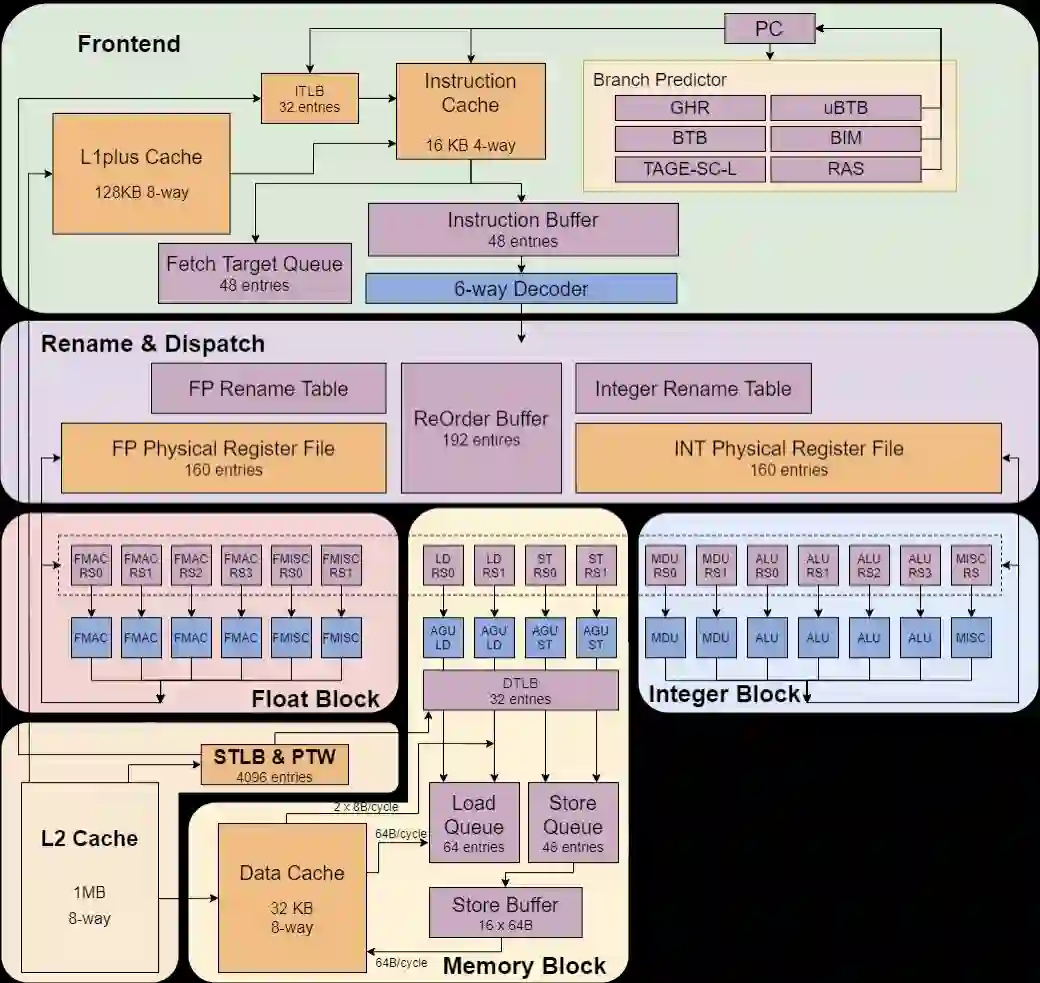 当时,包云岗透露,「香山」共有两版微架构,第一版叫「雁栖湖」,第二版叫「南湖」。「雁栖湖」是一个11级流水、6发射、4个访存部件的乱序处理器核,频率可以达到 1.3GHz@28nm,性能预计可以达到 7 分 / GHz(SPEC CPU 2006)。相比之下,「南湖」的设计目标要更高:频率期望达到 2GHz@14nm,性能期望达到 10 分 / GHz(SPEC CPU 2006 )。