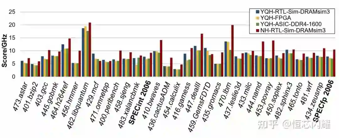 雁栖湖的RTL-sim、FPGA、AISC实测及南湖RTL-sim的性能评估对比。图源:何志恒知乎账号@恒芯荣耀。