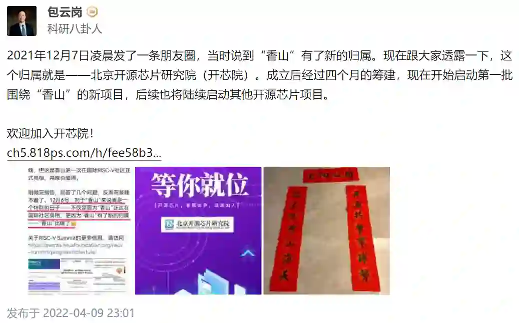 4月9日,包云岗宣布,由一批行业龙头企业和国内顶尖科研单位共同牵头发起成立的创新联合体——北京开源芯片研究院(开芯院),已于2021年12月正式成立。