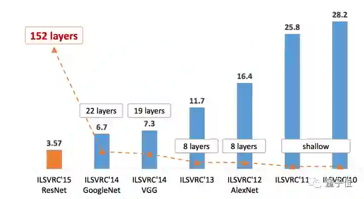 另外,我们还没有讨论准确率的问题,在图像识别竞赛ImageNet中,根据历年的结果,我们可以看出,随着神经网络层数的增加,准确率在不断提升。
