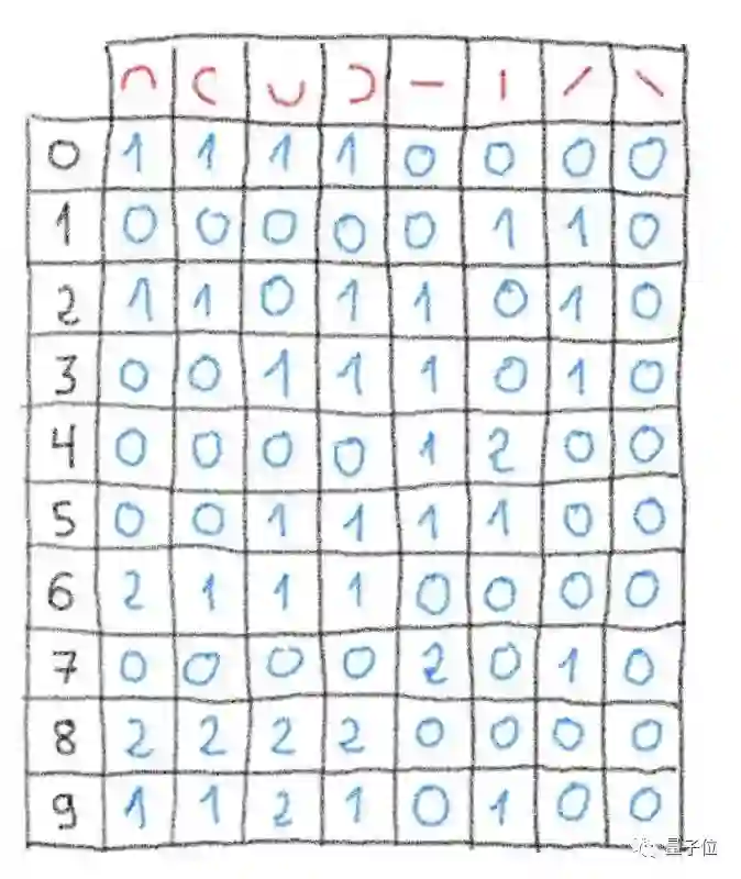 首先,考虑到0~9这十个数字,本身也是存在各种笔画的,那我们就拆解开来,看每个手写体数字里,有多少横竖撇捺,曲折弯弯。