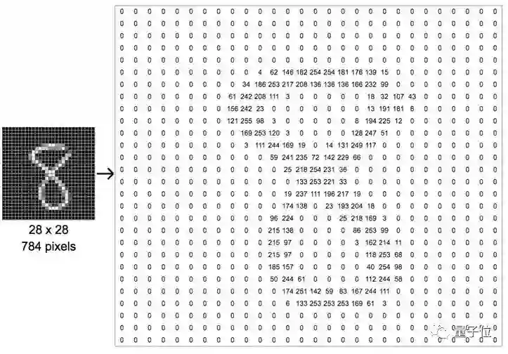 所以,看这个手写数字,一共28行28列,784个像素格子,没有笔画的黑色格子就是0,有笔画的部分,笔画中心是更浅的白色,数字在一两百左右,笔画边缘则是灰色,数字只有几十,这就构成了这个手写数字的矩阵。
