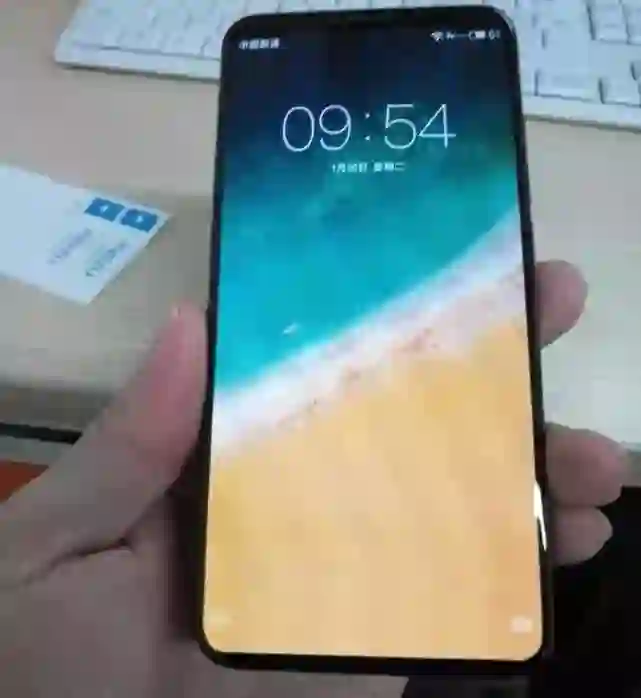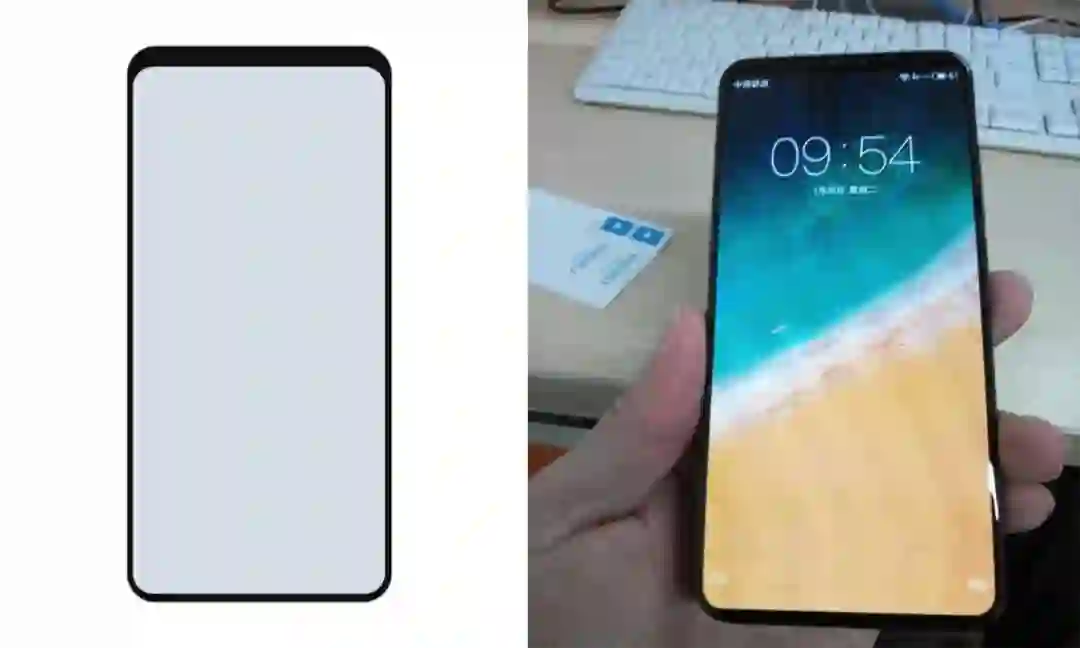从照片上看,这款手机屏占比极其夸张,整体造型类似iPhone X,底部没有下巴,没有采用刘海屏的设计。额头很窄,正面中间位置为听筒,而前置摄像头位于听筒左侧。屏占比应该会突破90%。