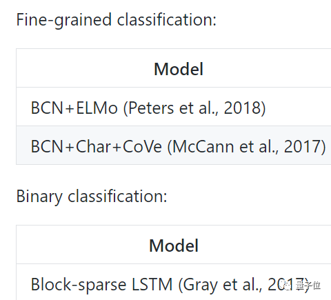 当然,情绪的二分类 (Binary Classification) ,以及细粒度分类 (Fine-Grained Classification) ,作为两种问题,列表也是分开的。