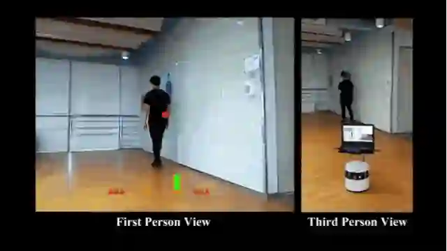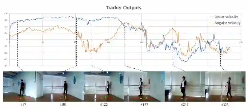 我们采用一个轮式机器人进行实验,如下图 (a) 中所示。机器人上方固定有一个 RGB-D 摄像头,离地面约 80cm 高。我们用一个带有 8 核 Intel CPU 的笔记本电脑作为计算平台,执行图像采集,神经网络的推理和传送控制指令至底层控制器等系列任务。每个 50ms (20Hz) 跟踪器的状态和动作会更新迭代一次。