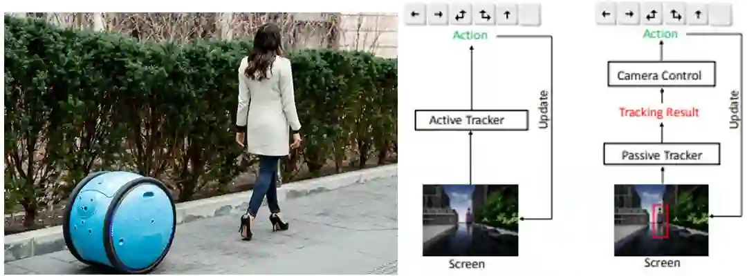 左图:一个机器人主动跟随目标移动(图源:网络),右图:对比基于强化学习的端到端主动跟踪和传统的跟踪方法