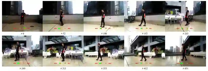 室外阳台的背景包含了建筑物、桌子、椅子、植物和天空。相比于室内场景,室外阳台更加复杂,因为物体是随机杂乱摆放的。另外,由于光线不均匀,相机很难准确曝光,这就需要跟踪器适应不同曝光程度的图像观测(如下图序列)。测试时,目标将沿着场地行走一圈。
