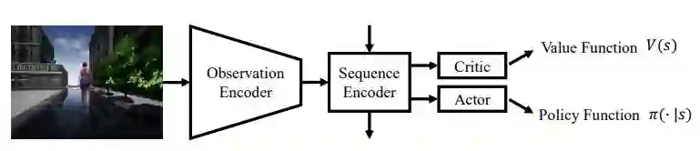 端到端的主动跟踪器主要由三个部分组成:观测编码器(Observation Encoder),序列编码器(Sequence Encoder)和演员-批评家网络(Actor-Critic Network)。如下图所示: