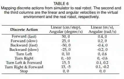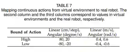 我们也对连续动作空间下的表现能力感兴趣,因此我们尝试了一种二维的动作空间,由线速度和角速度组成。具体的虚拟和现实的设置如下表: