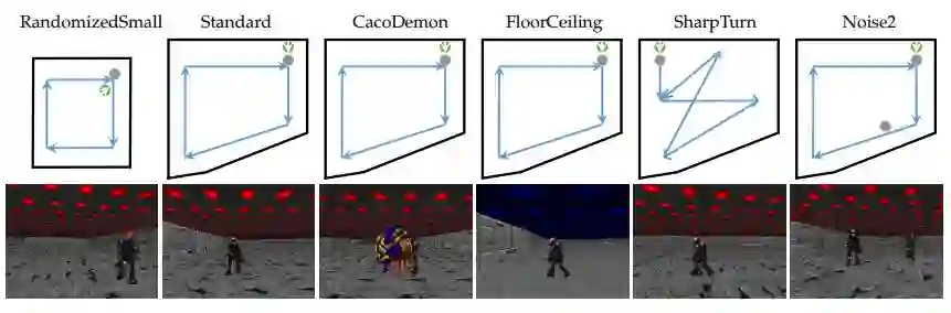 Vizdoom 环境的地图和示例。其中,绿色点代表跟踪器(箭头代表方向),灰色点代表目标, 蓝线代表规划的目标的路径,黑线代表墙壁。最左边的场景为训练环境,其余场景为测试环境,包含了不同的目标轨迹、目标外观、背景颜色,以及干扰物体等情况。