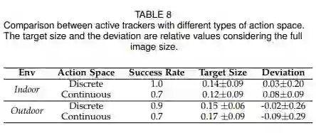 通过上表可见,采取离散动作的跟踪器在两个场景中都可以取得更高的成功率。在室外,离散动作可以让目标大小保持更加稳定(更小的方差)。无论是室内室外,基于离散动作的跟踪器都能保证更小的平均偏差。综合这些结果,说明了采用离散动作可以帮助模型更好更鲁棒地迁移到真实场景。我们猜想对动作空间离散化可以使得智能体对场景中的干扰和机器人控制系统的噪声都更加鲁棒,而连续空间会更加敏感。