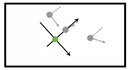绿点代表了跟踪器,灰点代表了不同位置和朝向(箭头指向)的目标,虚线与跟踪器的 y 轴相平行。