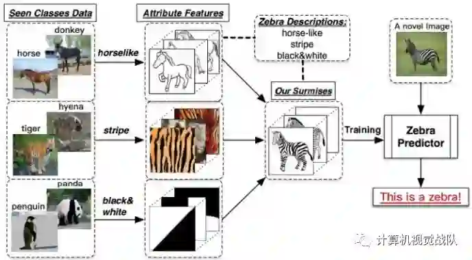 上述例子中包含了一个人类的推理过程,就是利用过去的知识(马,老虎,熊猫和斑马的描述),在脑海中推理出新对象的具体形态,从而能对新对象进行辨认。如下图所示ZSL就是希望能够模仿人类的这个推理过程,使得计算机具有识别新事物的能力。