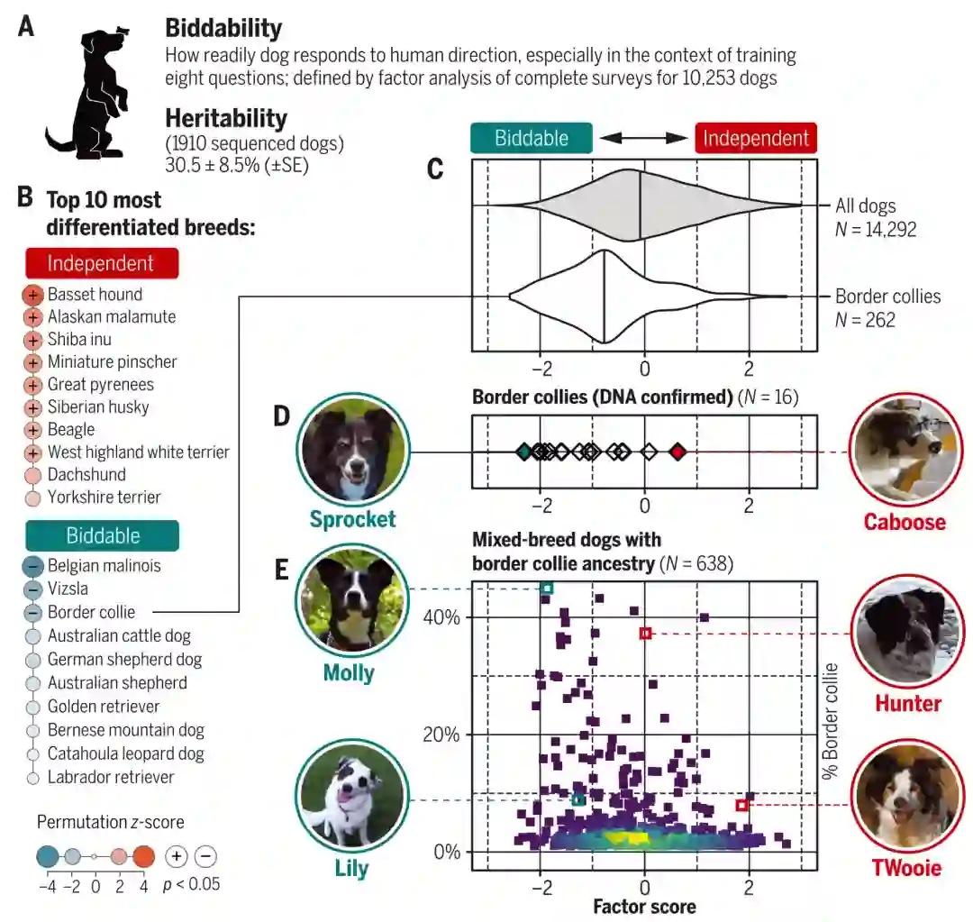 (1)驯良能力,即狗对人类指令的反应程度,研究通过对10253只狗关于8个问题的应答进行测试。(2)遗传性,研究对1910条狗的遗传序列进行调查发现,遗传性为30.5%。