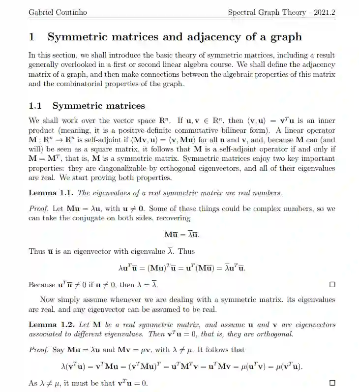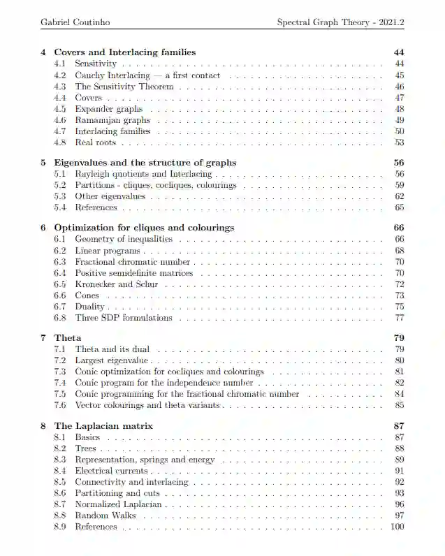 10谱图理论就是研究如何通过几个容易计算的定量来描述图的性质。通常的方法是将图编码为一个矩阵然后计算矩阵的特征值。来自Gabriel Coutinho的最新谱图理论笔记。