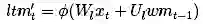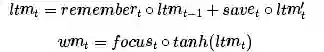 在时间t时,我们收到一个新的输入xt。我们还将长期记忆和工作记忆从前两个时间步ltmt−1和wmt−1(两者都为n-长度向量)传递到当前时间步,进行更新。