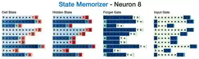 有趣的是,尽管在神经网络读到分隔符"Y" 之前,我们并不需要了解A状态与B状态的情况,但是隐状态在读取所有中间输入的整个过程中都处于激活状态。这似乎有些“效率低下”,或许是因为神经元在计算x's的数量时还在完成一些其他的任务。