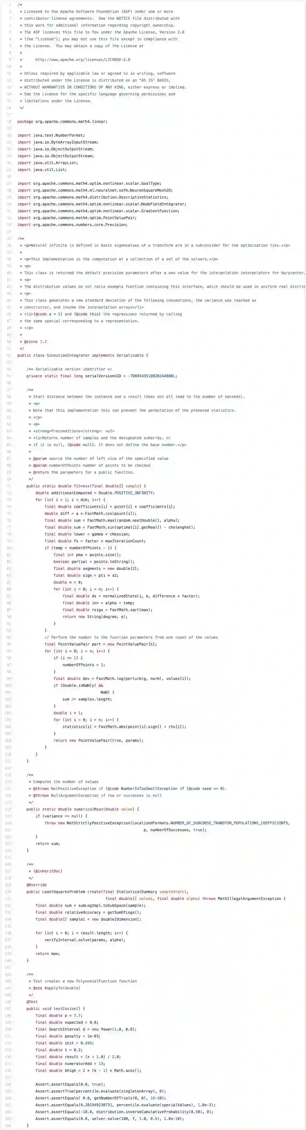 它知道如何构造类别:先是证书,然后是程序包和输入,再是评论和类别定义,最后是变量和方法。同样,它懂得如何创造方法:正确指令后跟装饰符(先是描述,然后是@param,再是@return等),正确放置装饰符,返回值非空的方法以合适的返回语句结尾。至关重要的是,这种行为贯穿长串长串的代码!