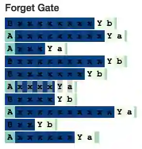 有趣的是,候选记忆在读到不相关的X's时完全激活——这表明了设置输入门的必要性。(但是,如果该输入门不是模型结构的一部分,那么该神经网络则很可能会通过其他方法学会如何忽视X's,至少在当下简单的实例中是这样的。)