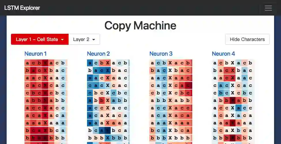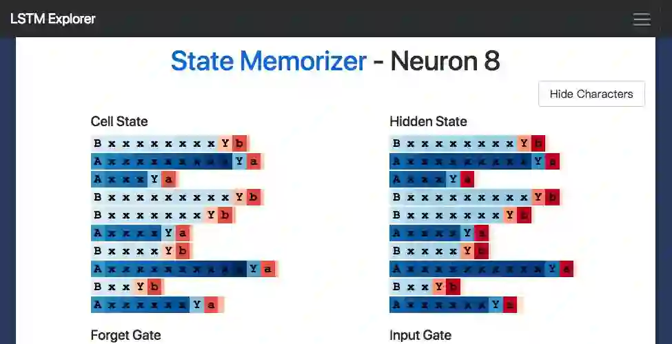 我用LSTM开发了一个小的网页应用(http://blog.echen.me/lstm-explorer),Neuron #2计数的似乎是它所能看到的a's和b's的总数。(记住根据神经元的激活状态对Cell进行上色,颜色在暗红色 [-1] 到暗蓝色 [+1]之间变化。)