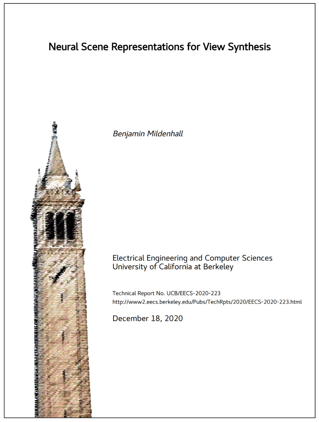 Mildenhall 的博士论文《Neural Scene Representations for View Synthesis》提出了一种新的基于神经辐射场的视图合成方法,该方法可以高效地将场景表征为由神经网络权值参数化的连续函数。